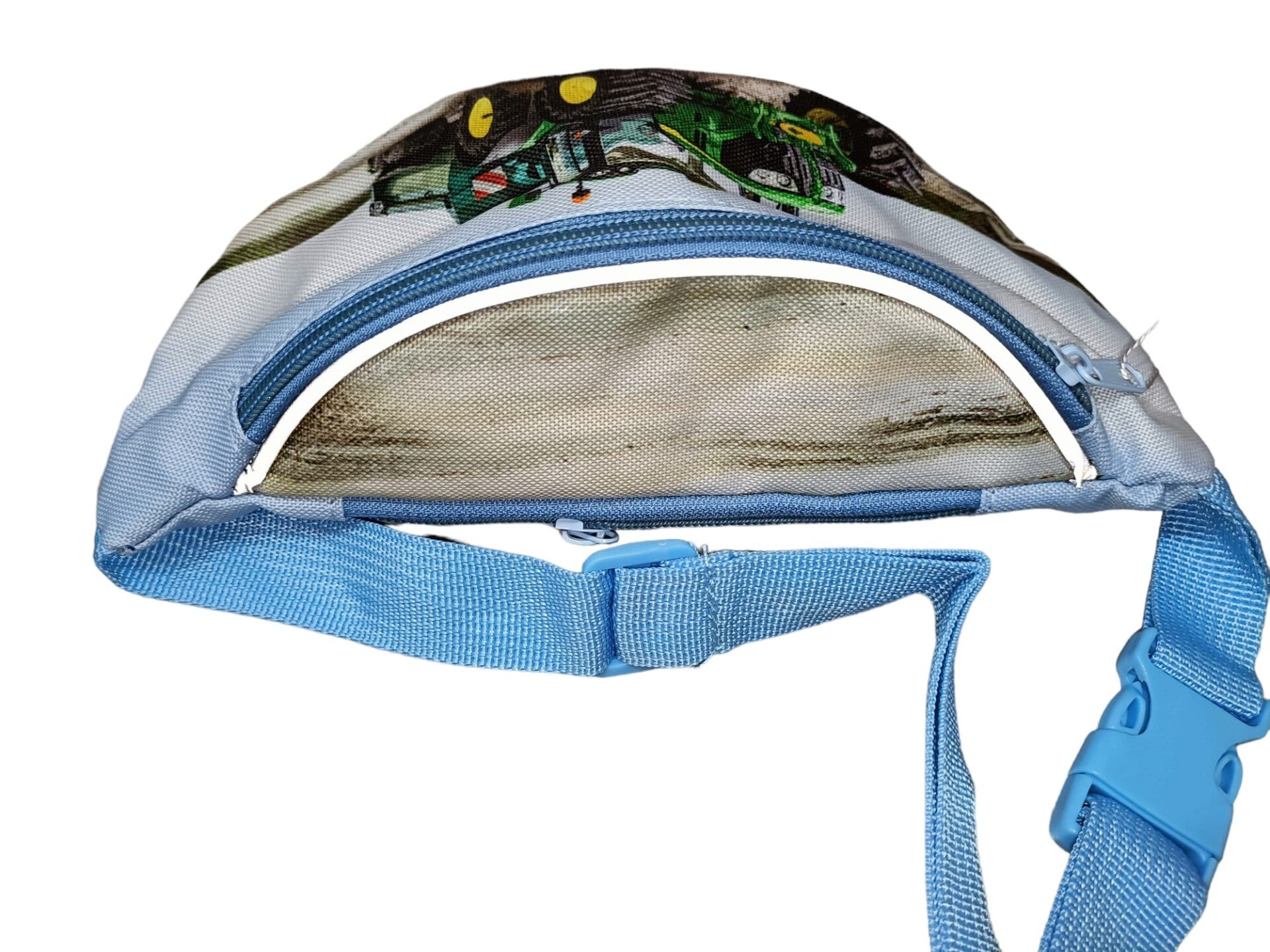 Leuk heup tasje voor de kinderen.Met een groene tractor zowel bedrukt aan alle kanten.2 vakjes met een rits en in het grote vakje zit een haakje waar ze hun sleutel aan vast kunnen maken.