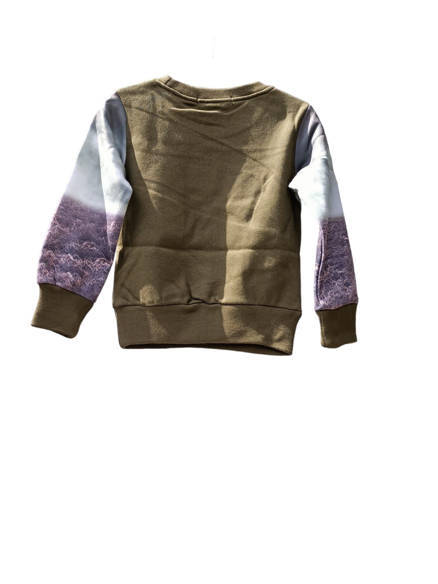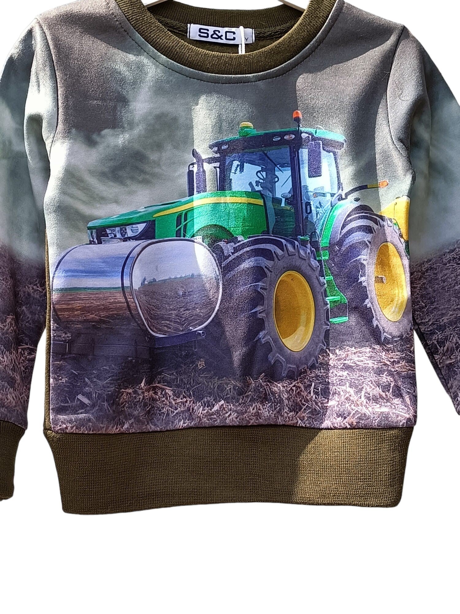 Leuke sweater in amry green met tractor print voor kant