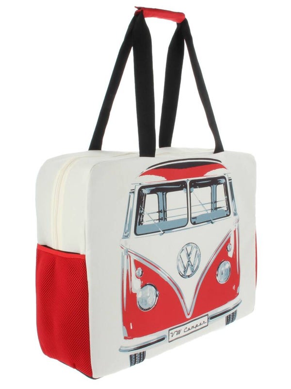 De trendy VW T1 Bulli Beach / Shopper tas is verkrijgbaar in twee uitvoeringen. Op de tassen staat de cultauto VW T1 Bulli Bus afgebeeld . Dankzij de brede draagbanden kan de tas comfortabel over de schouder gedragen worden. Het heeft een grote centrale opening met ritssluiting. Een cool detail zijn de busvormige ritssluitingen. Aan beide zijden bevinden zich praktische gaasvakken voor flessen, schoenen of soortgelijke spullen. Binnenin de tas zit een klein vakje, deze is tevens af te sluiten met een rits. Er zijn twee interne compartimenten voor portemonnee of kleine spullen. De shoppertas is een geweldig cadeau! Ideaal als klein bedankje of souvenir. Het scoort altijd punten als souvenir en fanartikel.