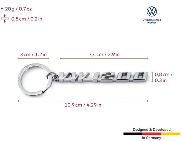 Design / Gift Idea / Miscellaneous: The silver keychain with the beautiful "VW1200" inscription is something special for every VW fan! This wonderful sight immediately evokes a feeling of nostalgia from the 50s, 60s, and 70s - freedom, wanderlust, and joie de vivre. A fitting extra is the keyring (charm) in the shape of the VW logo, which also hangs on the keyring. This keychain makes for a perfect gift and is a great present to bring along. It's perfect as a small thank-you gift for friends or loved ones. The keychain is also suitable as a Germany souvenir and fan merchandise. The beautiful keychains are also available in the VW T1 Bus/Campervan or VW GTI design!