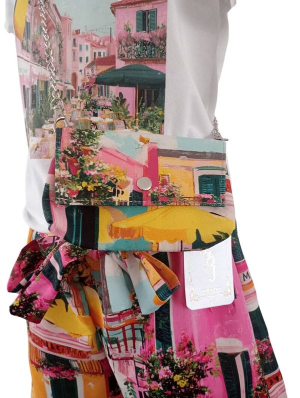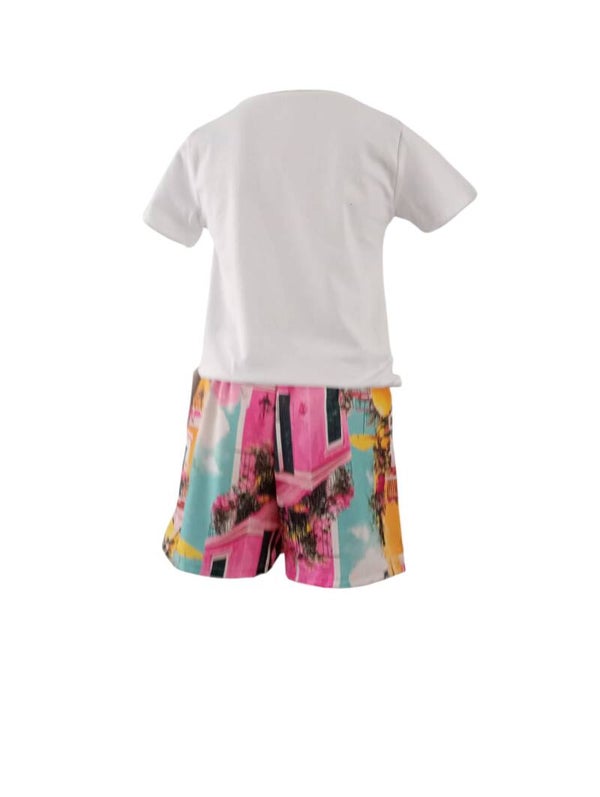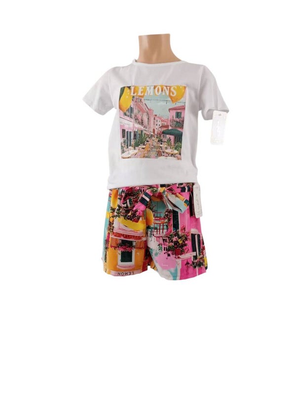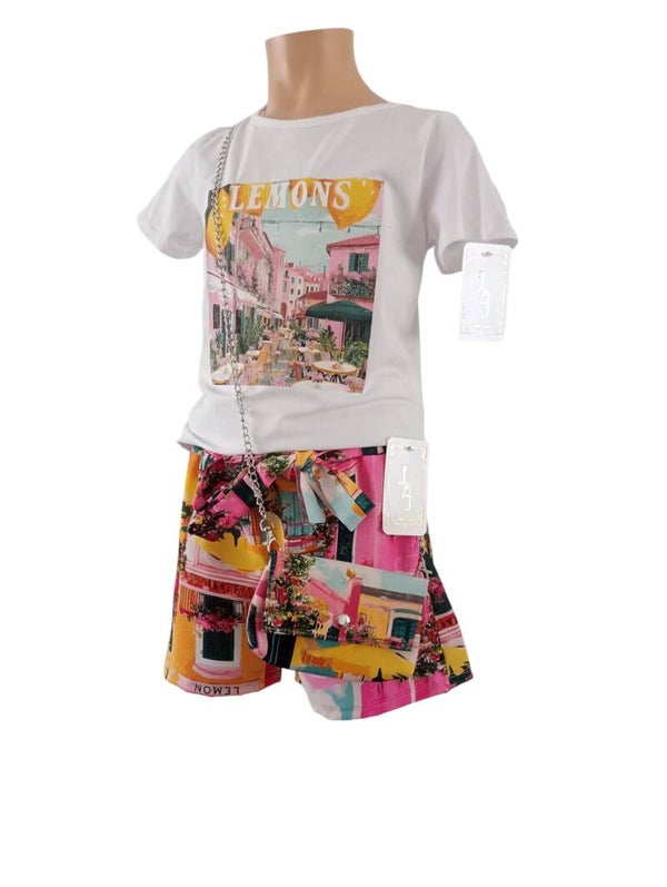 Bestaat uit een korte broek t-shirt en een bijpassende tasje
