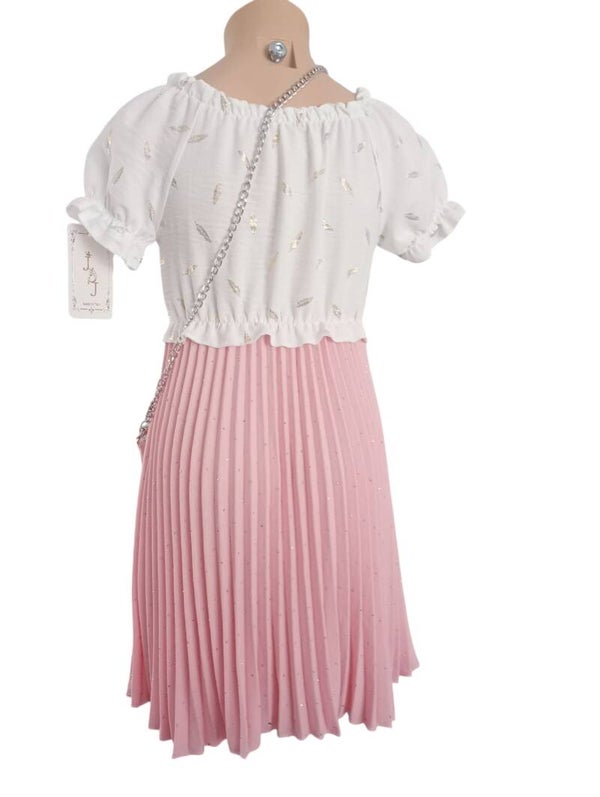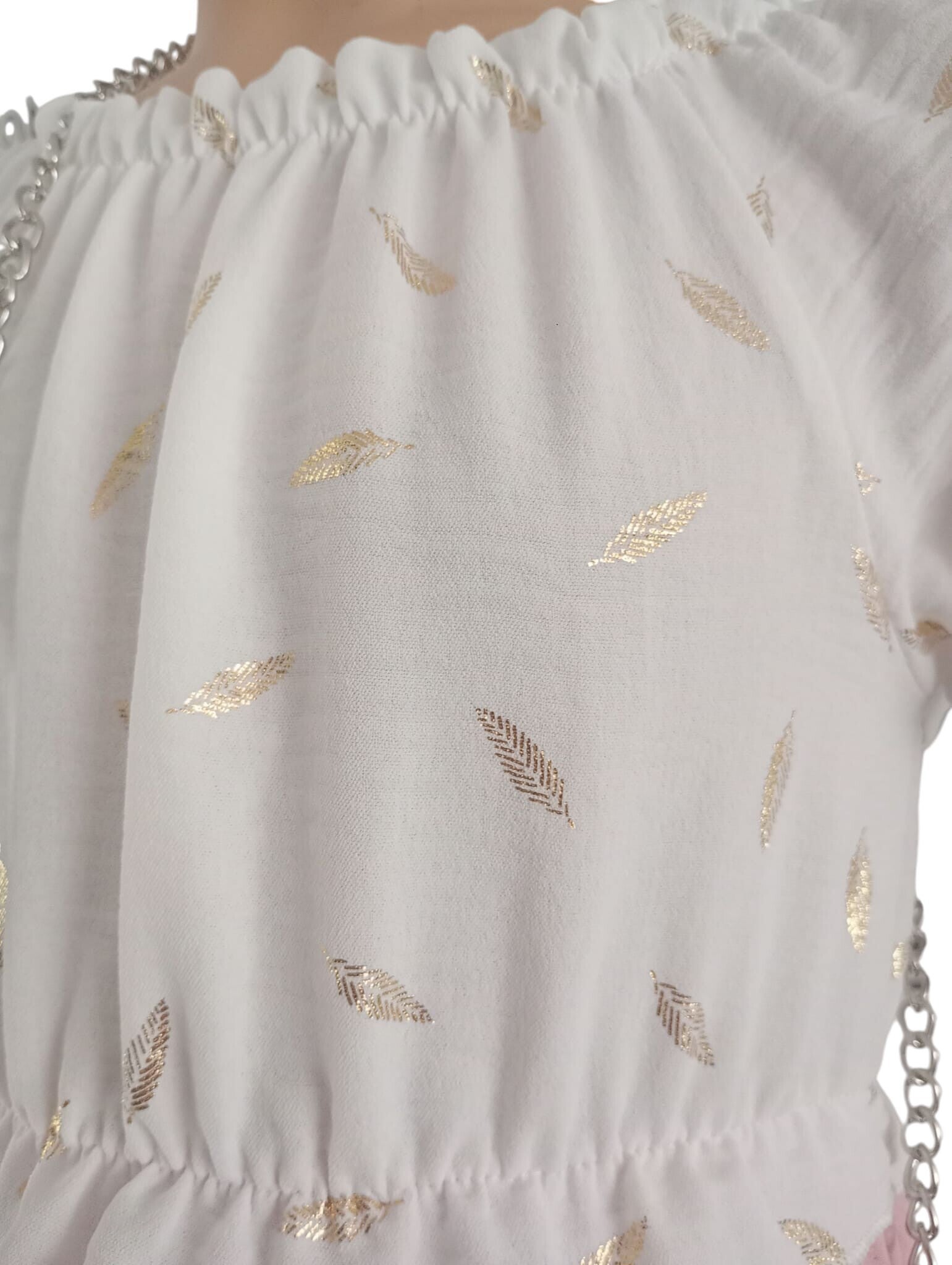 Jurkje met goudkleurige veren op de boven kant en een plisse met gliters aan de onderkant.